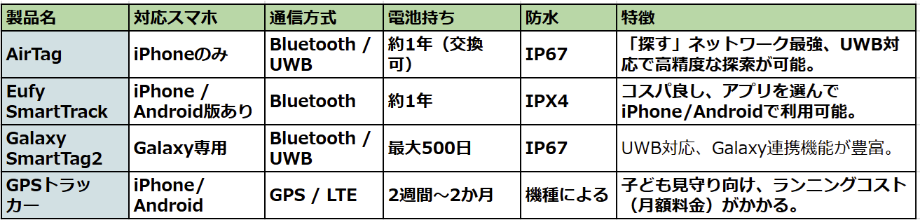 人気Bluetooth型モデル比較:AirTag・Eufy・Galaxy